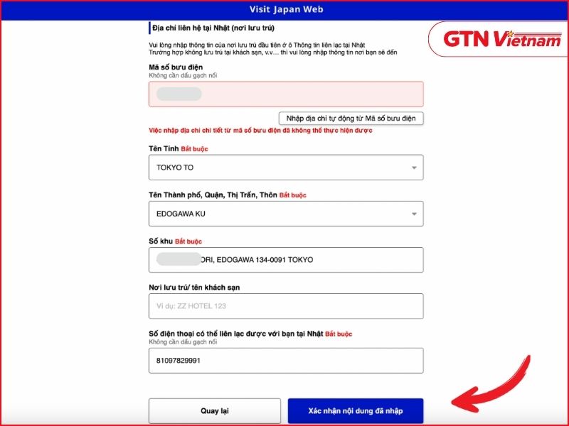 Nhập địa chỉ lưu trú tại Nhật Bản sau khi nhập cảnh, bao gồm mã bưu điện, tỉnh/thành phố, số nhà và số điện thoại liên hệ.