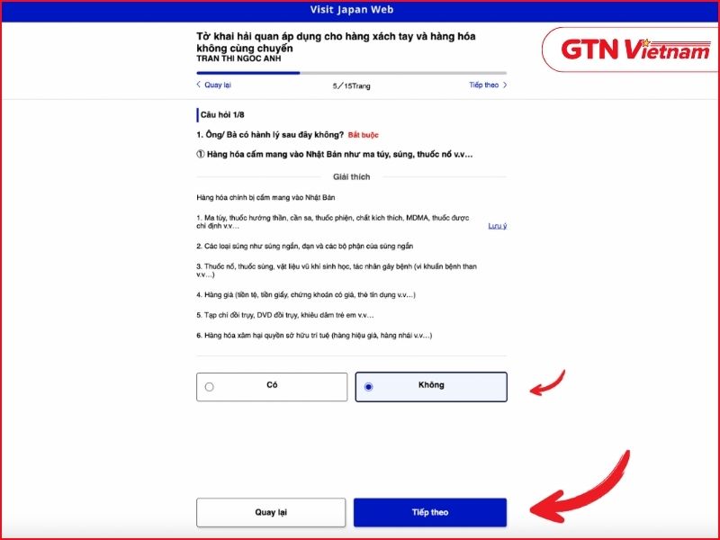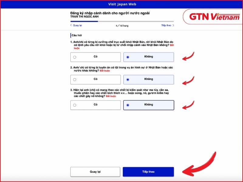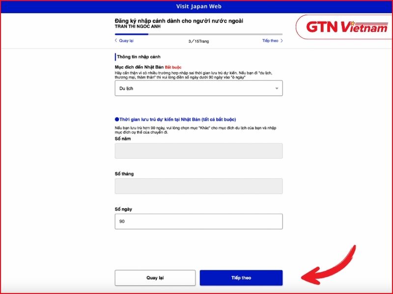 Nhập mục đích nhập cảnh, thời gian lưu trú dự kiến và trả lời các câu hỏi liên quan đến tiền sử xuất nhập cảnh.