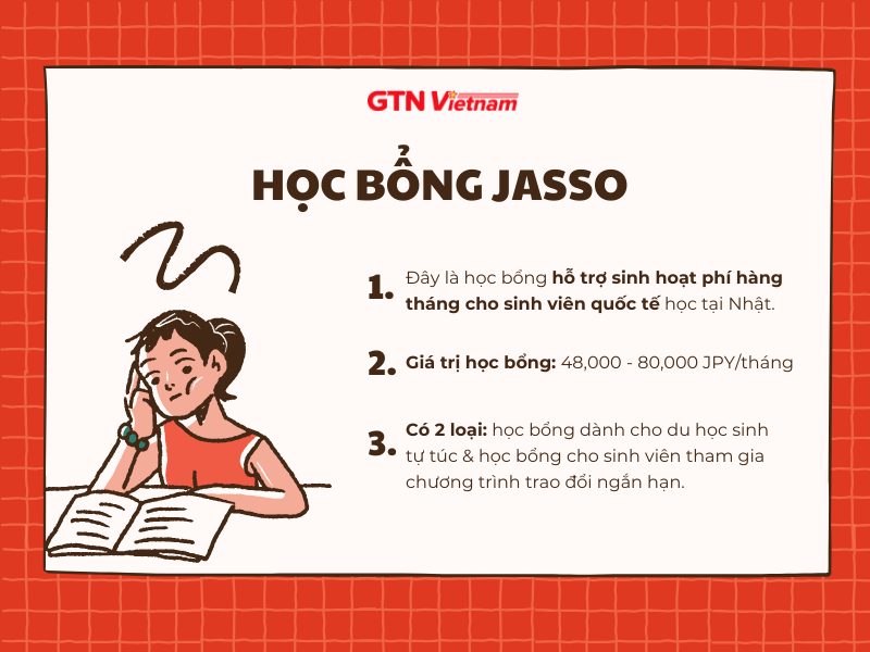 JASSO Scholarship là học bổng do Tổ chức Hỗ trợ Sinh viên Nhật Bản (Japan Student Services Organization) cấp, nhằm hỗ trợ sinh viên quốc tế đang học tại Nhật Bản giảm bớt chi phí sinh hoạt.