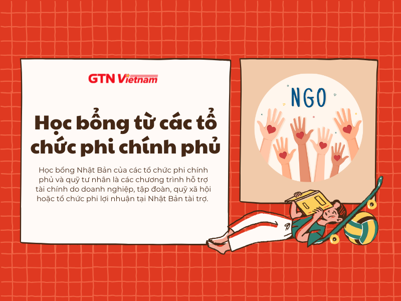 Học bổng Nhật Bản của các tổ chức phi chính phủ và quỹ tư nhân là các chương trình hỗ trợ tài chính do doanh nghiệp, tập đoàn, quỹ xã hội hoặc tổ chức phi lợi nhuận tại Nhật Bản tài trợ. Các học bổng này nhằm hỗ trợ sinh viên quốc tế đang học tập tại Nhật Bản, giúp giảm bớt gánh nặng chi phí sinh hoạt và học tập, đồng thời đào tạo nguồn nhân lực chất lượng cao có định hướng gắn bó lâu dài với Nhật Bản. Phần lớn học bổng thuộc nhóm này không phải học bổng toàn phần, tuy nhiên có giá trị hỗ trợ ổn định, điều kiện xét tuyển linh hoạt và tỷ lệ trúng tuyển cao hơn so với học bổng Chính phủ Nhật Bản (MEXT). Các chương trình học bổng này sẽ được tổ chức quanh năm tuy nhiên sẽ bị giới hạn với một số ngành nghề.